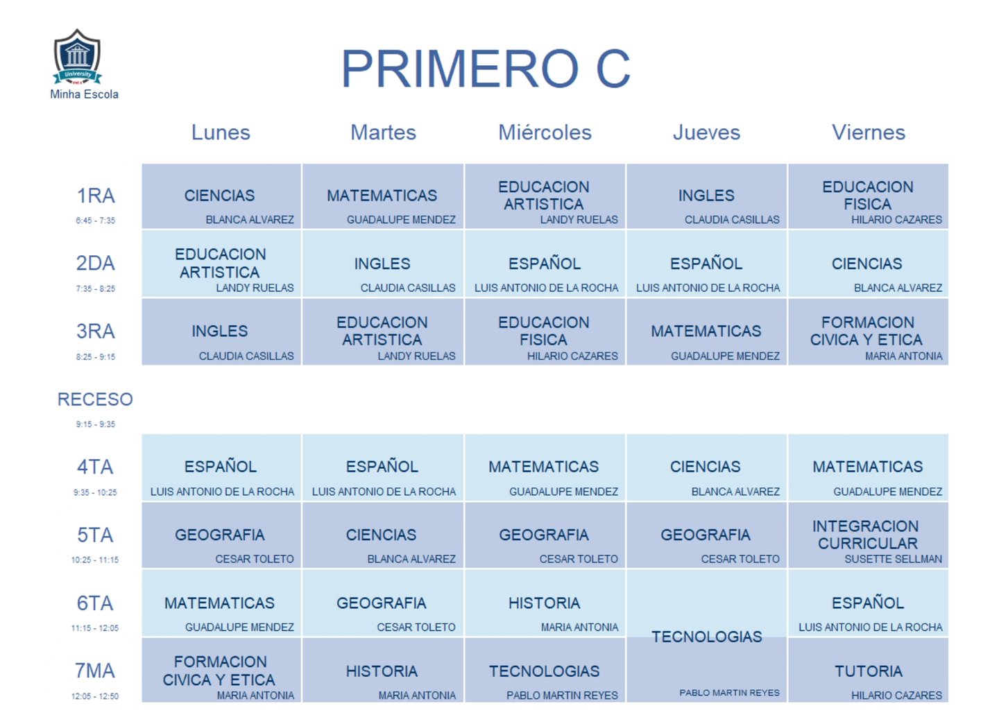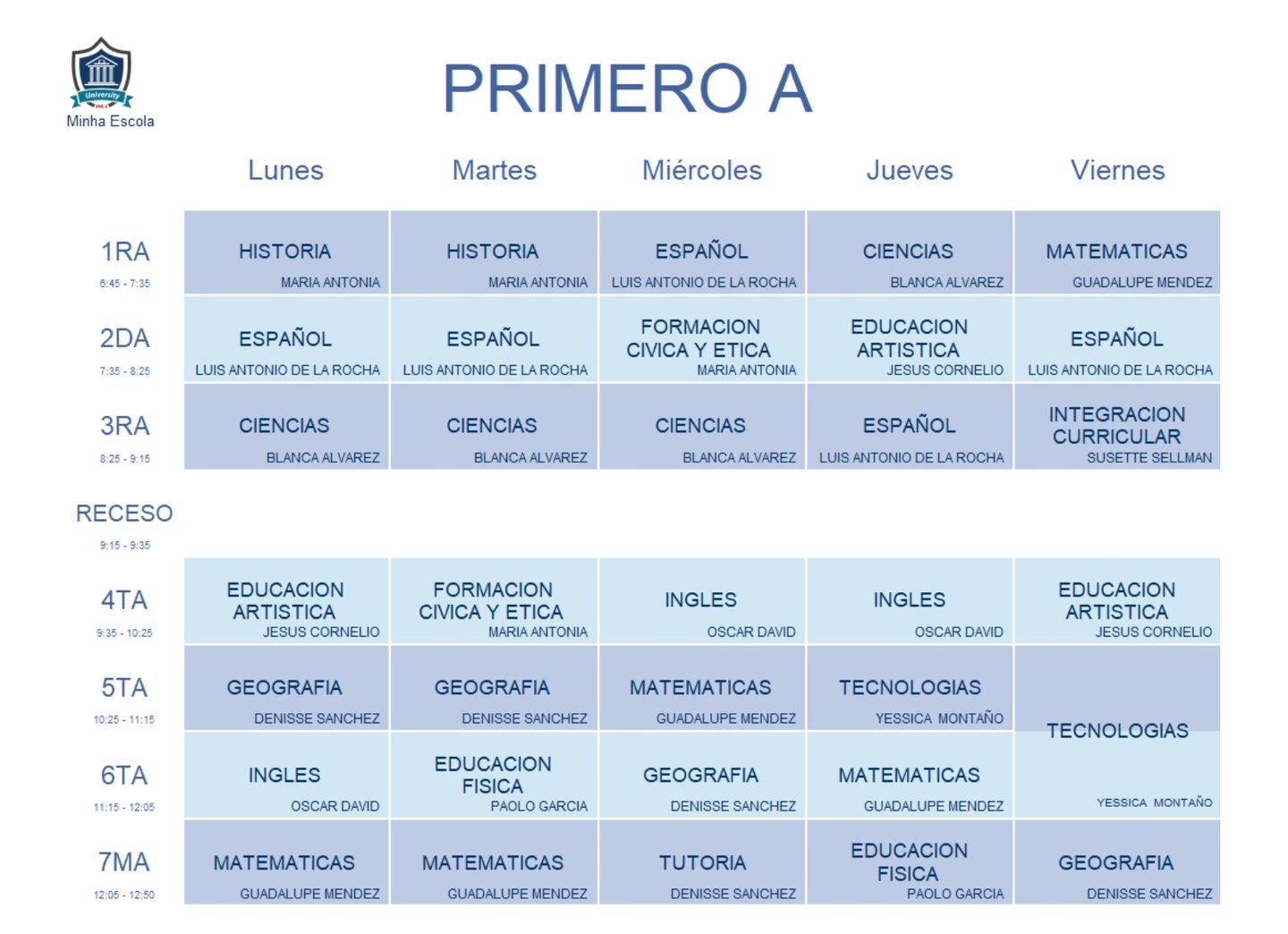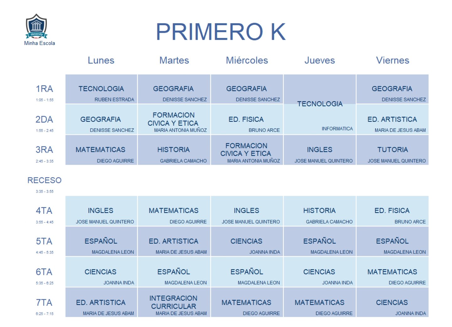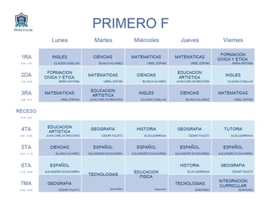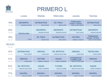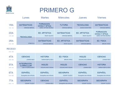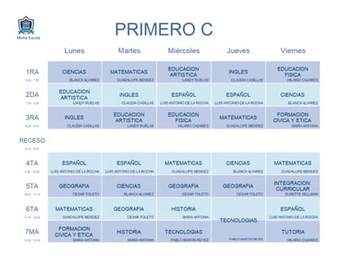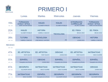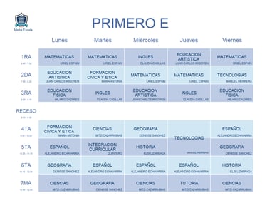 Bienvenidos a la pagina de horarios de primer grado, aquí en encontrara todas los horarios de este mismo y sus respectivos maestras encargados de cada asignatura.